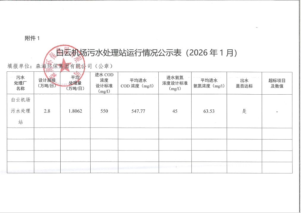 白云机场污水处理站运行情况公示表(2026年1月)