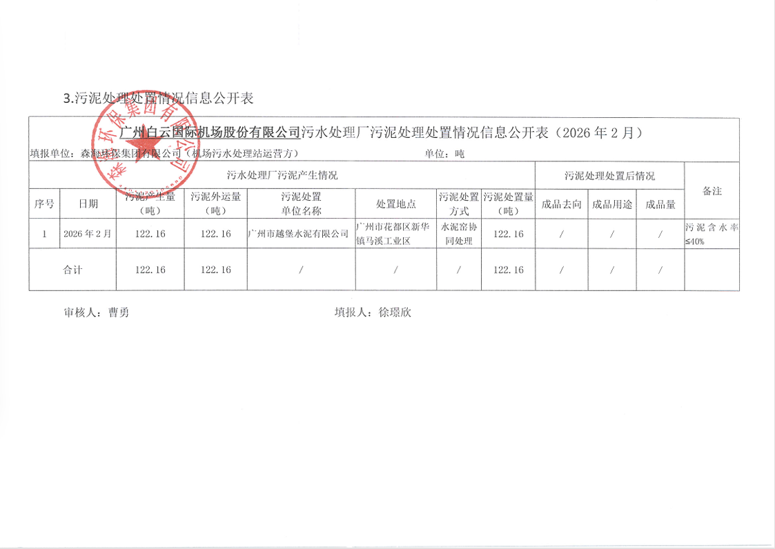 白云机场污水处理站污泥处理处置情况信息公开表(2026年2月)