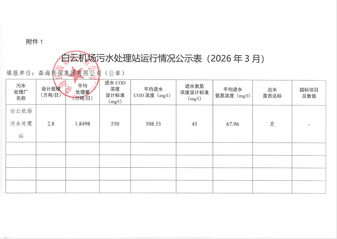 根据水务局要求现对白云机场污水处理站2026年3月份水质情况进行公开: