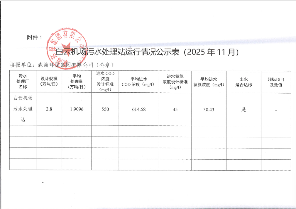 白云机场污水处理站运行情况公示表(2025年11月)